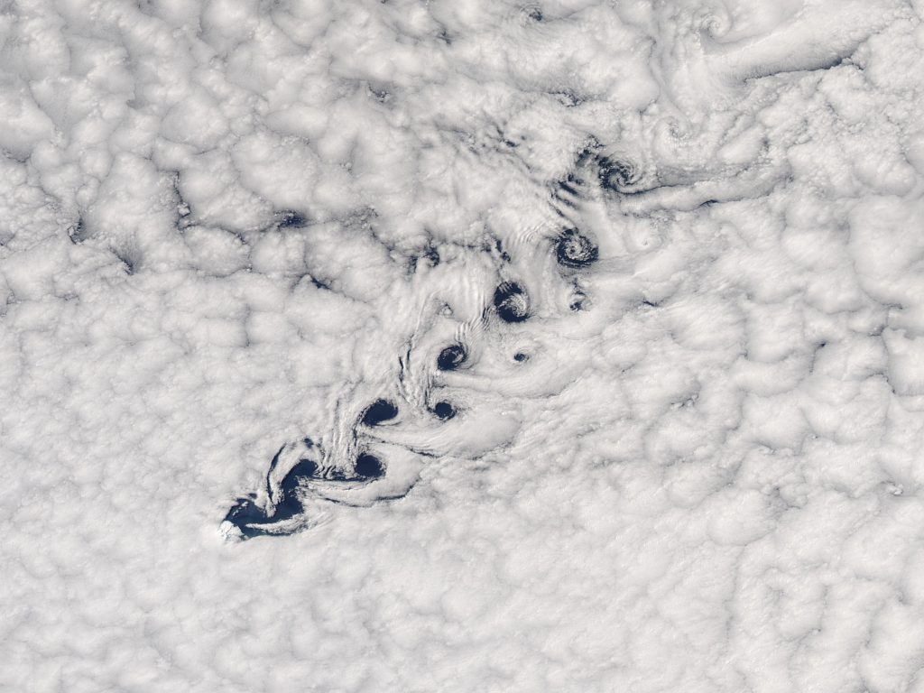This photo of cloud vortices over Australia’s Heard Island near Antarctica shows the physical phenomenon known as vortex shedding. The Moderate Resolution Imaging Spectroradiometer aboard NASA’s Aqua satellite was captured on Nov. 2, 2015, at 5:02 a.m. EST (09:20 UTC).