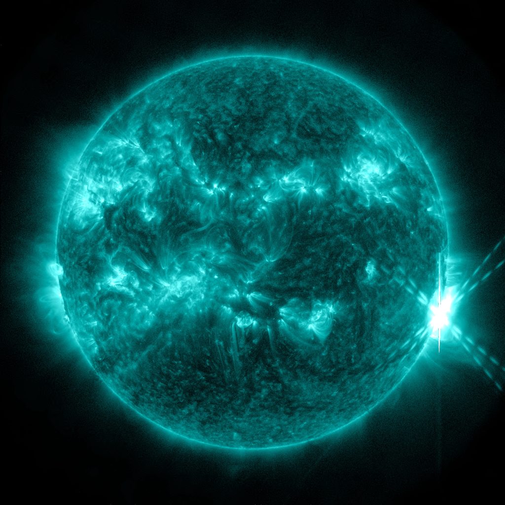The Atmospheric Imaging Assembly on NASA’s Solar Dynamics Observatory captured this image of an X3.4 solar flare — as seen in the bright flash on the right — at 4:37 a.m. ET on May 15, 2024. Colorized in teal, the image shows a subset of extreme ultraviolet light (131 angstroms), highlighting the hot material in flares.